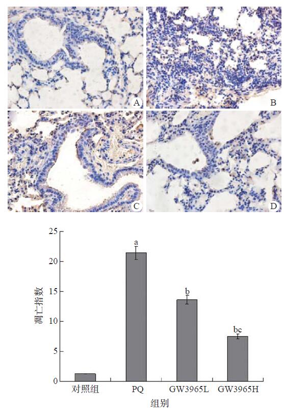 百草枯染毒组小鼠凋亡指数显著高于对照组(P < 0.05),与百草枯染毒组比较GW3965处理组凋亡指数明显下降(P < 0.05),且GW3965高剂量组效果更显著(P < 0.05)。见图 4。