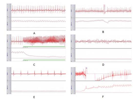 A:诱颤前的基础生理参数;B:针灸针刺入心外膜时;C:给予电刺激诱发CA;D:刺激结束后心电图示室颤;E:刺激结束后心电图示无脉性电活动;F:给予除颤后 图 2 实验大鼠致颤与复苏过程中的心电及血压波形变化 Figure 2 The ECG and blood pressure waveform during cardiac arrest and CPR |