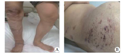 图 1 患者右下肢血管瘤(站立时)(A); 臀背部先天性痣状毛细血管畸形(葡萄酒色斑)(B) |