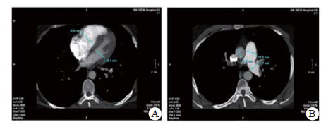 图 3 患者溶栓后10 d复查CTPA, 右室扩张明显好转(A)、肺动脉增宽有所缓解(B) |