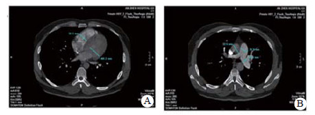图 2 患者CTPA(溶栓前):房室瓣水平显示右室明显扩张(A); 主肺动脉水平显示肺动脉增宽(B) |