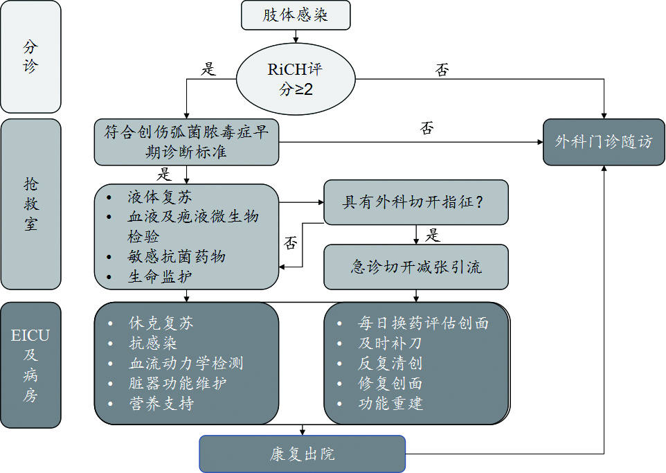 创伤弧菌脓毒症患者常以发烧和肢体红肿疼痛就医,很多医护人员对该病没有足够的经验,容易延误诊断[51]。分诊医生和护士在接诊疑似肢体感染的患者,应掌握快速获取关键信息的技巧,可帮助早期识别出危及生命的肢体感染患者。分诊过程中可应用预检分诊RiCH评分表(表 2):①快速进展的肢体病损;②低血压;③既往慢性肝病、嗜酒或免疫功能不全病史。RiCH评分≥2,应视为重症患者,需分诊至抢救室救治,并电话启动创伤弧菌脓毒症MDT小组或通知有相应经验的外科医生,进一步评估。若不能满足上述条件,可暂时将患者分诊至外科门急诊就诊与评估。