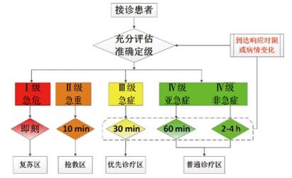 3.3 响应时限与再评估机制[14]响应时限是基于急诊预检分诊原则及医院医疗环境资源而确定,本共识推荐各级别患者响应时限如下:Ⅰ级急危患者为即刻,Ⅱ级急重患者为10 min,Ⅲ级急症患者为30min,Ⅳ级亚急症患者为60 min、非急症患者为2~4 h。各响应时限的设定应以“轻、重、缓、急”为指导,在保证医疗安全的前提下,根据本地区及医院医疗环境与资源做适当调整。