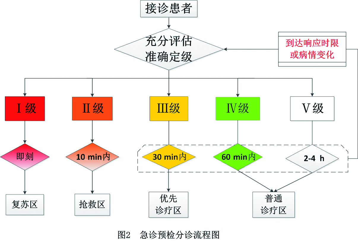 2.2 准确快速分级分区急诊预检分诊不仅要依据科学的标准进行准确分级,还要安排有能力的分诊人员和借助敏感性高的分诊工具进行快速、准确分诊,并要合理建设规划急诊患者的就诊区域,实现分区救治,最终实现急诊患者就诊的安全性及高效性。
