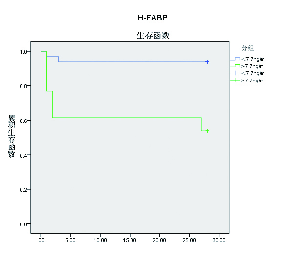 图 2 入PICU 6 h内H-FABP≥7.7 ng/mL患儿组和H-FABP < 7.7 ng/mL患儿组的Kaplan-Meier生存曲线分析 Figure 2 Kaplan-Meier curves of H-FABP. The survival rate of patients for H-FABP < 7.7 ng/mL was higher than that of patients who H-FABP≥7.7 ng/mL were negative (P < 0.05) |