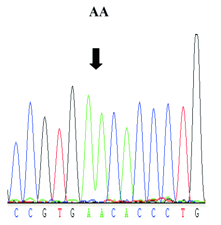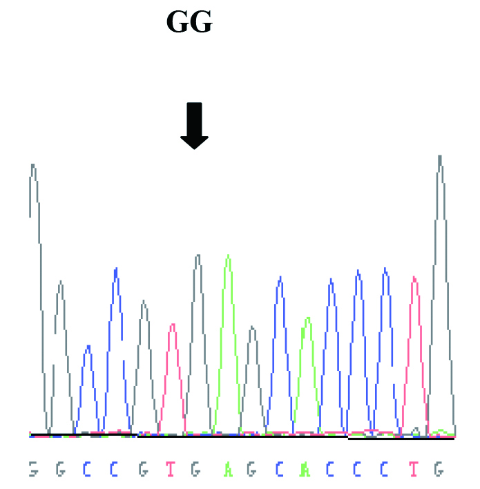 实验组中检测出SP-C基因exon5区域c.715G > A(S186N)位点可检出三种基因型:即GG、AA、AG型。见(图 1、2、3)。RDS组此三种基因型频率分别为28%、62%和10%,G等位基因频率为33%,A等位基因频率为67%;对照组此三种基因型频率分别为78%、10%和12%,G等位基因频率为84%,A等位基因频率为16%;实验组A等位基因型频率高于对照组,差异有统计学意义(χ2=53.300,P < 0.05)见表 3。