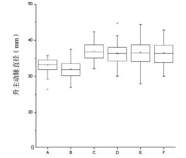 A:男性正常组(n=50); B女性正常组(n=50); C:男性胸痛对照组(n=55); D:女性胸痛对照组(n=45); E:男性Stanford B型AD组(n=40); F:女性Stanford B型AD组(n=16) 图 1 各组不同性别人群升主动脉直径比较 Figure 1 Comparison of ascending aorta diameter in different groups |