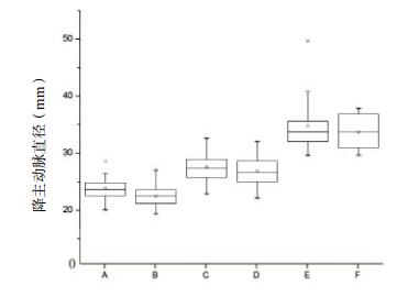 A:男性正常组(n=50); B女性正常组(n=50); C:男性胸痛对照组(n=55); D:女性胸痛对照组(n=45); E:男性Stanford B型AD组(n=40); F:女性Stanford B型AD组(n=16) 图 2 各组不同性别人群降主动脉直径比较 Figure 2 Comparison of descending aorta diameter in different groups |