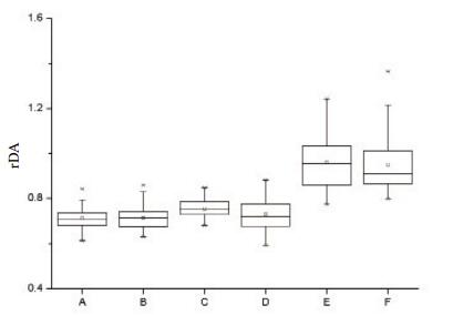 A:30~49岁正常组(n=50); B:50~80岁正常组(n=50); C:30~49岁胸痛对照组(n=31); D:50~80岁胸痛对照组(n=69); E:30~49岁Stanford B型AD组(n=15); F:50~80岁Stanford B型AD组(n=41) 图 3 各组不同年龄段人群rDA的比较 Figure 3 Comparison of rDA in different age groups |