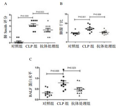 BALF蛋白水平测量结果提示,CLP组较对照组明显升高(t=4.331, P < 0.01),抗体处理组可见较CLP组有所下降(t=2.484, P=0.023),见图 2C。