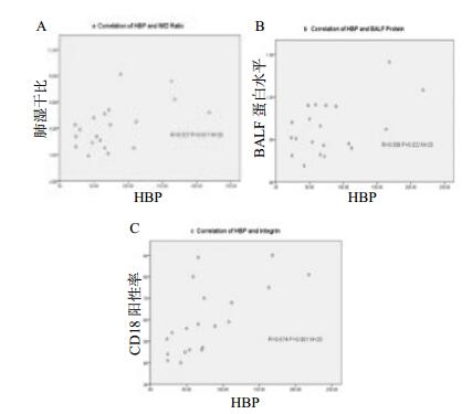 | A:HBP与肺干湿比; B:HBP与BALF蛋白水平; C:HBP与CD18阳性率 图 4 血清HBP与肺损伤相关指标的相关性分析 Figure 4 Correlation analyses of HBP and lung injury related index |