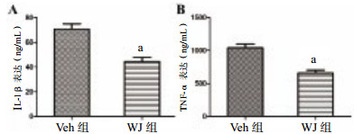 与Veh组比较,aP < 0.05 图 2 各组IL-1β和TNF-α的表达情 Figure 2 Expression of IL-1β and TNF-α in each group |
