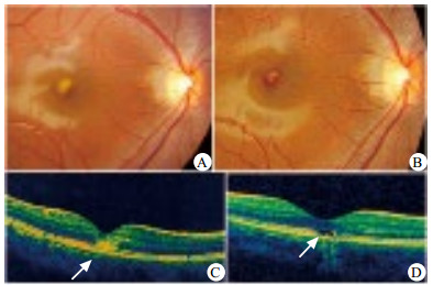 A:右眼伤后第2天,黄斑部见淡黄白色圆斑状病灶,视力0.2;B:伤后3个月,黄斑中心凹脱色素,伴颗粒状色素沉着,视力0.9;C:伤后第2天, OCT检查示黄斑中心凹处视网膜色素上皮层(RPE)与外丛状层之间出现圆形和放射状高反射病灶(箭头示);D:伤后3个月,OCT检查示黄斑中心凹处RPE、嵌合体带和椭圆体带缺失,伴小空腔形成(箭头示) 图 1 轻度激光笔性黄斑损伤的眼底和OCT表现 |