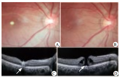 A:右眼伤后第3天,黄斑部见致密黄白色圆斑状病灶,视力0.05;B:伤后1个月,黄斑全层裂孔,伴黄白色斑点,视力0.05;C:伤后第3天, OCT检查示黄斑部累及视网膜全层的柱状高反射病灶(箭头示);D:伤后1个月,OCT检查示黄斑全层裂孔伴周围囊肿形成(箭头示) 图 2 重度激光笔性黄斑损伤的眼底和OCT表现 |