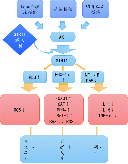 | 图 1 SIRT1对不同诱因诱导的AKI的保护机制 |
