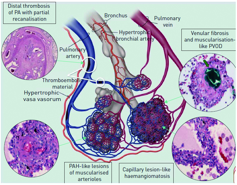 CTEPH的发病机制不仅仅涉及到残存血栓负荷,肺动脉壁瘢痕形成、炎症反应、小血管病变及右室功能障碍均与CTEPH的发生、发展密切相关。机械性阻塞和继发内皮细胞炎症在CTEPH的发生、发展过程中起着非常关键的作用。越来越多证据提示肺动脉功能紊乱,纤维蛋白溶解障碍及远端小动脉损伤在CTEPH的发展中同样起着重要的作用[19-20]。