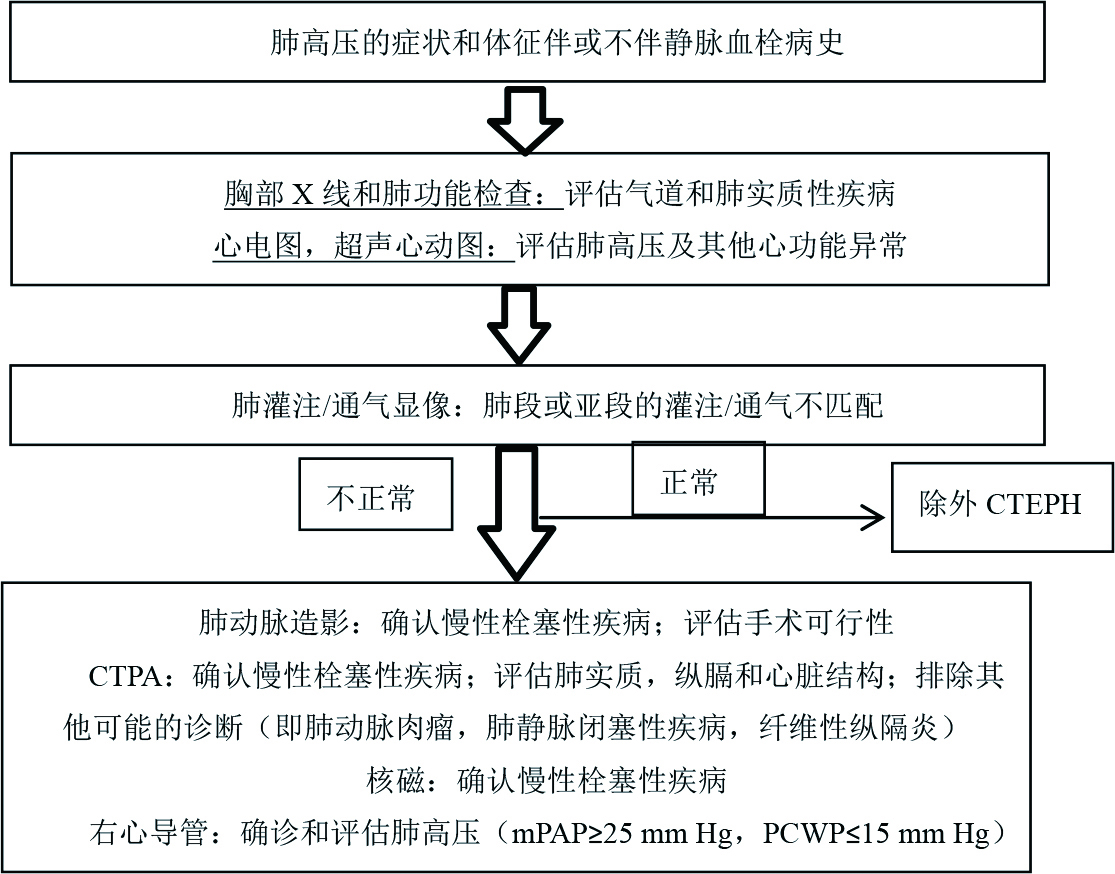 4 诊断 4.1 临床特征CTEPH早期因症状不典型或者不明显,早期诊断较为困难。通常伴有进行性呼吸困难,运动不耐受,可伴有下肢水肿、疲劳、不典型胸痛等。随着病情进展,逐渐出现右心衰竭可以表现为头晕、晕厥等症状[35]。查体时可闻及P2亢进,剑突下可触及心尖抬举样搏动及可闻及收缩期杂音。右心功能进一步恶化可表现为颈静脉怒张,肝颈静脉回流征阳性、肝肿大、水肿等[36]。CTEPH患者常伴有中到重度低氧血症,一旦肺动脉高压合并右向左分流即出现艾森曼格综合征时,其低氧血症表现会更加明显且无法通过吸氧来改善,严重影响着患者的生活质量[28]。