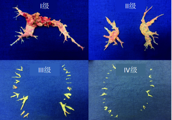 根据血栓的位置,UCSD建议将CTEPH中的肺血栓栓塞分为各级:Ⅰ级:累及肺动脉主干;Ⅱ级:始于肺动脉段;Ⅲ级:始于肺动脉亚段;Ⅳ级:仅限于肺动脉亚段。此外,IC级为单只肺动脉完全闭塞,右肺动脉或左肺动脉完全闭塞,0级则未见相应肺内CTEPH(图 5)。值得注意的是,这种分类是在PEA术中进行的分类。随着成像方式的改进,术前预测疾病水平的能力有所提高,尽管不是所有情况都能进行预测。对于Ⅲ至Ⅳ级病变即使专业性更强的术者进行手术,并发症的发生率也更高,但手术成功后血流动力学仍有望得到改善。