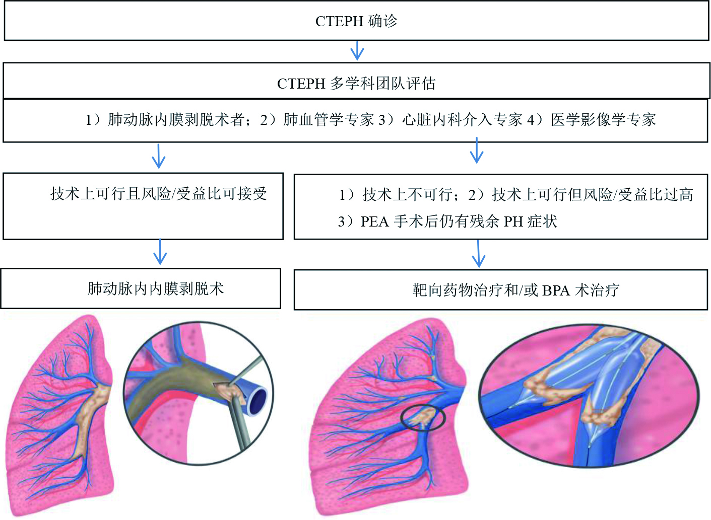 5 CTEPH治疗CTEPH患者无论选择何种治疗方案,均需要终身抗凝[1]。一旦确诊CTEPH,患者需要评估PTE手术(PEA)的可行性。如手术不可行或术后出现持续性肺高压症状或手术风险过高,需要考虑靶向药物治疗或靶向药物联合球囊肺血管成形术(balloon pulmonary angioplasty, BPA)治疗。通常会选择药物治疗联合BPA以稳定血流动力学并改善预后[18]。