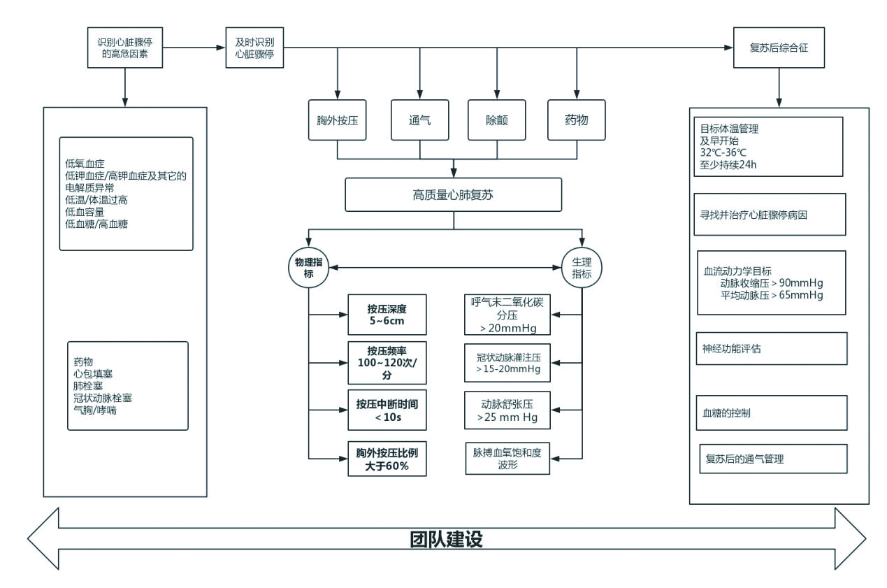 心肺复苏是心搏骤停最重要的治疗手段。越来越多的证据表明心肺复苏的质量与患者预后直接相关[1]。目前我国缺乏心肺复苏质量控制的临床标准和执行规范。为提高我国成人院内心肺复苏质量,协助医疗专业人员更好地实施高质量的心肺复苏,进一步改善心搏骤停患者的预后,亟待制定中国心肺复苏质量控制专家共识。本共识将从早期预警与识别、高质量心肺复苏、复苏后管理、团队建设四个方面阐述复苏全程的质量控制要点,见图 1。