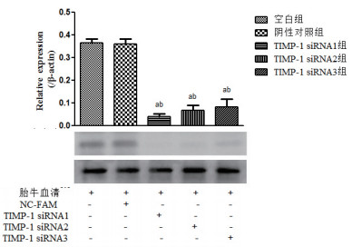 2 结果 2.1 Western blot筛选高效的siRNA片段3对序列均可抑制TIMP-1蛋白表达,其中siRNA1序列对TIMP-1蛋白的抑制效果最佳,故选其进行后续实验,见图 1。