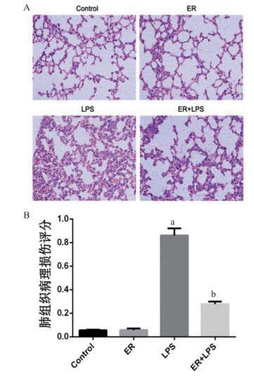 A肺组织HE染色(×400)Control:空白对照组;ER:厄洛替尼灌胃对照组;LPS:LPS诱导ALI组;ER+LPS:厄洛替尼灌胃后LPS处理组;B肺组织病理损伤评分;与Control组相比较, aP < 0.05;与LPS组相比较, bP < 0.05 图 1 肺组织病理改变及肺损伤评分 Figure 1 Pathological changes of lung tissue and lung injury score