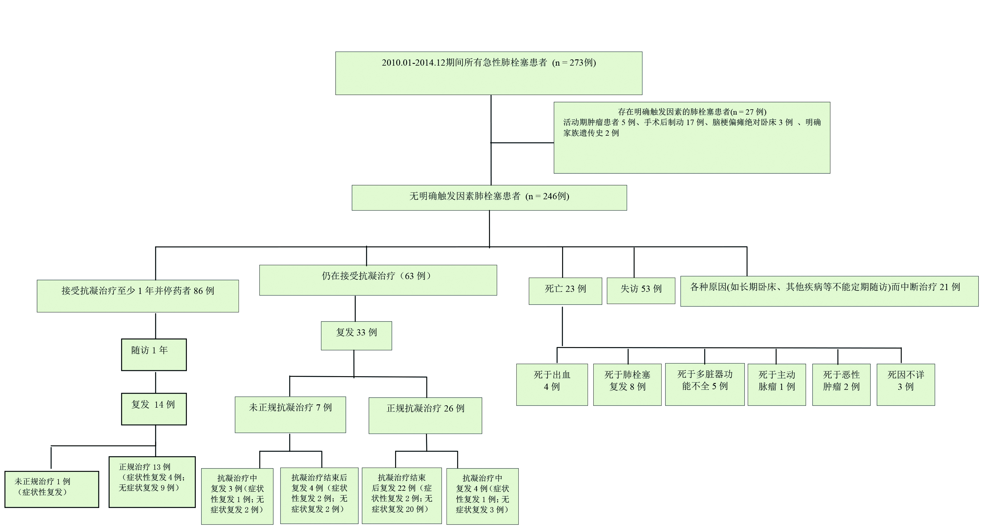 1.4 患者相关信息包括年龄;性别;体质量指数(body mass index, BMI);明确诊断PE的时间;家族史;既往病史,如冠状动脉硬化性心脏病、高血压、血脂代谢紊乱、糖尿病、吸烟、高同型半胱氨酸血症(hyperhomocysteinemia, HHCY)、阻塞性睡眠呼吸暂停综合征(obstructive sleep apnea syndrome, OSAS)等;本次发病是否存在明确触发因素;抗凝治疗开始的时间;抗凝期间是否规律随诊;治疗达标情况;随访过程中是否发现肿瘤(如果存在,记录肿瘤部位、治疗方法及其转归);目前抗凝药物的使用状态,是否按医嘱停用抗凝药(记录具体时间)、持续使用抗凝药物者需具体记录继续使用抗凝药物的原因如合并心房纤颤、治疗中确诊复发、心脏瓣膜置换术或者是没有任何原因继续使用;对于明确存在复发者,记录患者明确复发的手段及部位、复发时间(记录治疗结束后还是抗凝治疗中)、属于症状性复发还是无症状性复发;患者的转归,如已经死亡的患者记录具体死亡原因。