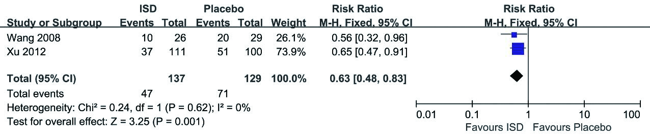 2项包含266例患者的观察性研究证实了免疫抑制治疗与中重度百草枯中毒患者MODS发生率的降低明显相关(RR=0.30;95% CI:0.16~0.56),异质性较低(I2 = 0%)(图 2)。