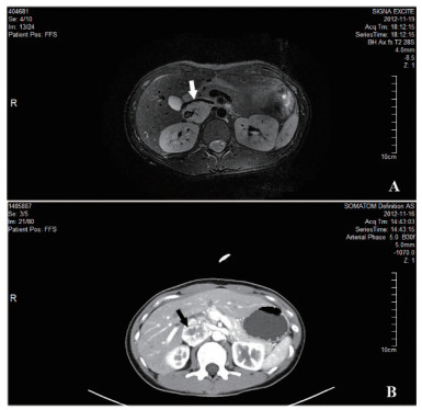 图 1 肾上腺增强MRI:右侧肾上腺区域见类圆形等T1长T2异常信号影,大小约29 mm×37 mm,内部信号欠均匀,边缘光整,下腔静脉受压前移,增强后病灶明显持续性强化,嗜铬细胞瘤可能性大(箭头)。 B:肾上腺增强CT:右侧肾上腺见肿块影,大小约38 mm×29mm,内部密度不均,增强扫描呈明显不均匀强化,边界尚清,下腔静脉受压前移,嗜铬细胞瘤可能(箭头) |