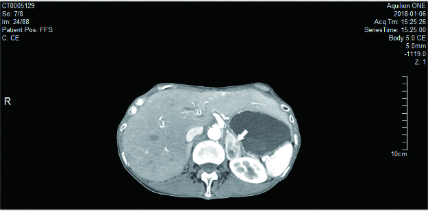 | 图 2 腹部CT:左侧肾上腺见一不规则肿块,大小35.3 mm×19.9 mm×29.4 mm(前后×左右×上下),边界清,平扫密度不均,增强扫描明显不均匀强化,中心见不规则囊变坏死区,提示左侧肾上腺占位,考虑嗜铬细胞瘤(箭头) |