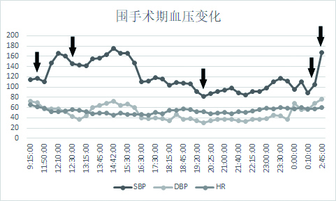 | 图 3 围手术期血压变化。箭头1.嗜铬细胞瘤手术开始;箭头2.嗜铬细胞瘤手术结束;箭头3.血管活性药物及扩容开始;箭头4.血肿清除止血术开始;箭头5.血肿清除止血术结束 |