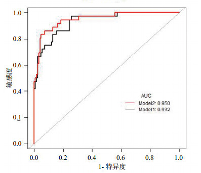 模型1为传统指标的ROC曲线(AUC=0.932),模型2为传统指标加上心肌损伤标记物的ROC曲线(AUC=0.950),传统指标的参数包括CRP与PCT值、CTSI评分、BISAP评分、APACHE Ⅱ评分和SOFA评分,心肌损伤标记物包括proBNP、CK-MB和cTnI。Model 1 vs. Model 2,P=0.09 图 1 模型1与模型2对SAP的预测效应 Figure 1 The predictive effect of model 1 and model 2 for SAP