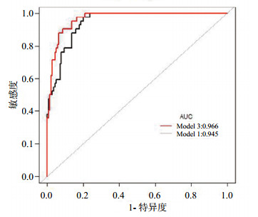 模型1为传统指标的ROC曲线(AUC=0.945),模型3为传统指标加上CK-MB、cTnI的ROC曲线(AUC=0.966)。Model 1 vs. Model 3, P=0.04 图 3 模型1与模型3对SAP的预测效应 Figure 3 The predictive effect of model 1 and model 3 on SAP