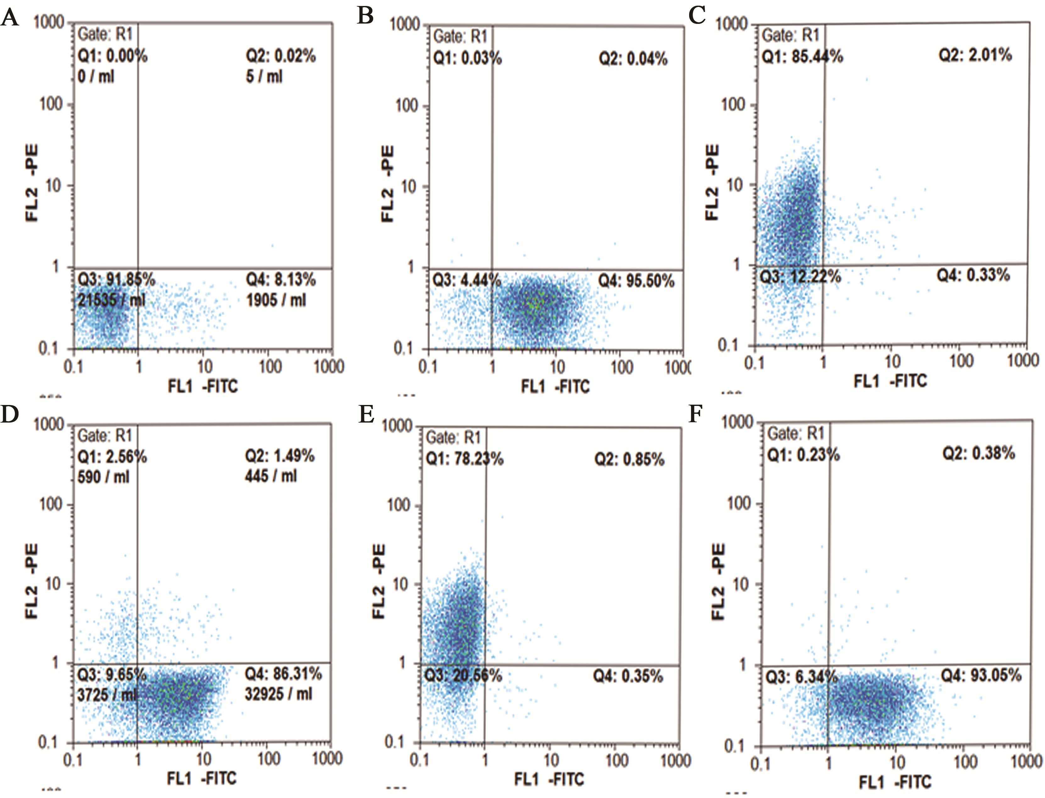 A:空白对照组;B:单标抗体CD90+;C:单标抗体CD44+;D:双标抗体CD90+CD34-;E:双标抗体CD44+CD45-;F:绿色荧光蛋白(GFP)标记的BMSC;FITC为异硫氰酸荧光素,PE为藻红蛋白 图 1 BMSC的流式细胞仪鉴定 Figure 1 Identification of BMSC by flow cytometry |