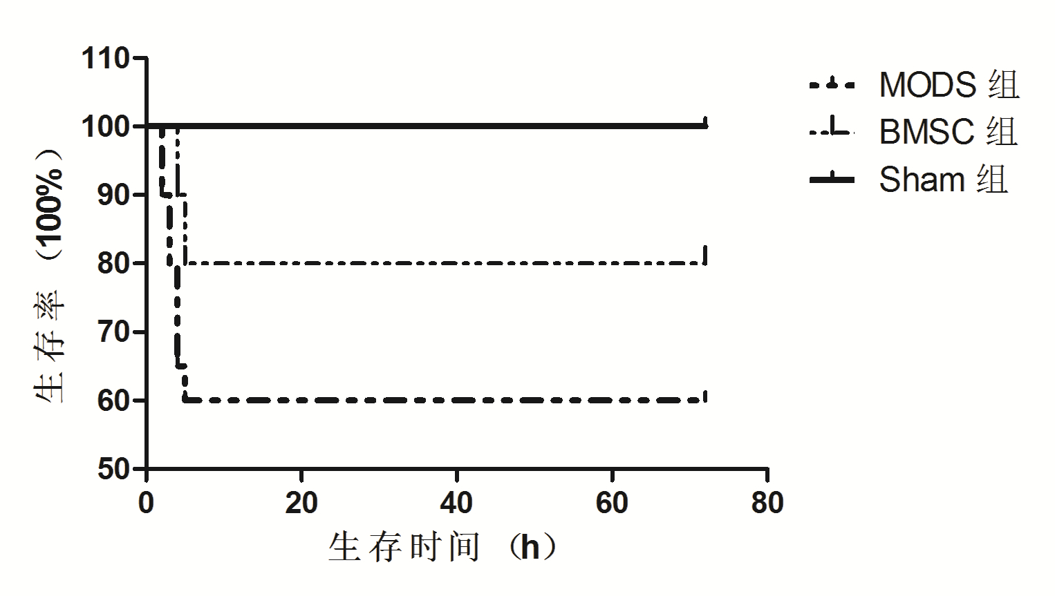 Sham组,MODS组以及BMSC组中大鼠术后72 h的生存率分别为100%、60%、80%。三组生存率进行log-rank法检验显示(图 2):Sham组的生存率明显大于MODS组及BMSC组(Sham vs. MODS χ2=9.798,P=0.001 7;Sham vs. BMSC χ2=4.333,P=0.037 4),差异有统计学意义;BMSC组的生存率大于MODS组(BMSC vs. MODS χ2=2.408,P=0.120 7),但差异无统计学意义。