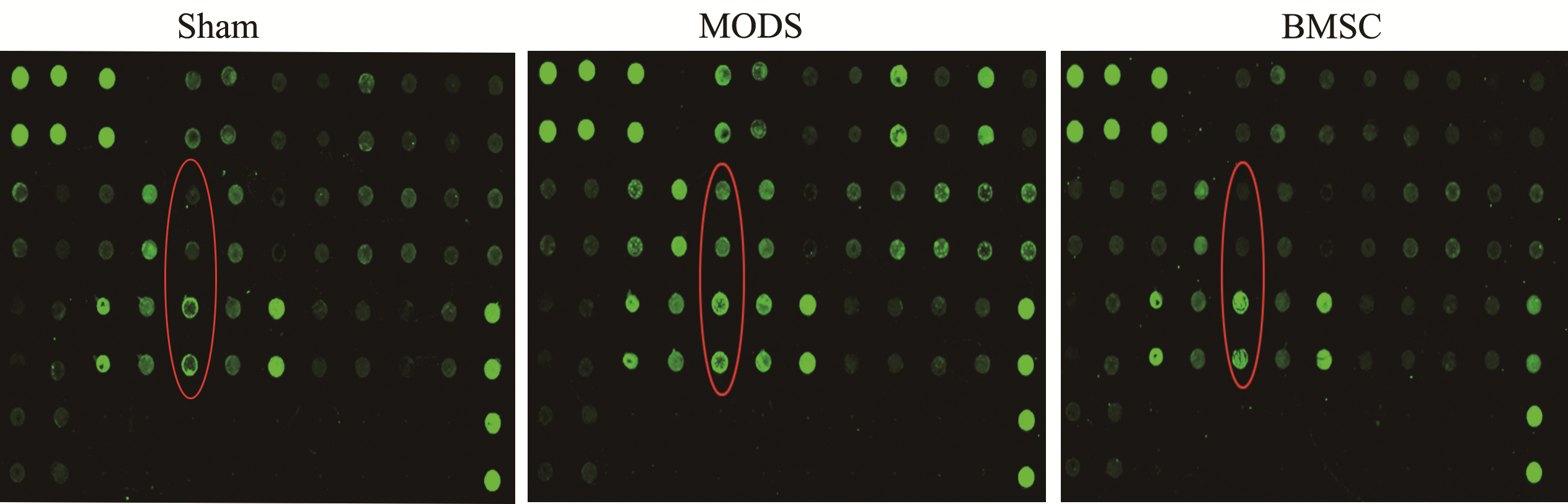 34种目标因子在蛋白芯片上清晰可见,蛋白芯片(图 4)及分析结果(表 3)显示,与Sham组比较,MODS组IFN-γ和MCP-1的表达水平升高(信号比值分别为5.763,3.474)。BMSC移植治疗后,IFN-γ和MCP-1的表达水平明显降低(信号比值分别0.104,0.185);各因子排布情况见图 5。