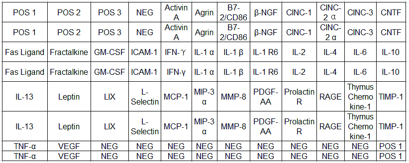 POS,阳性对照;NEG,阴性对照;CINC,中性粒细胞趋化因子;Fractalkine,一种趋化因子;CNTF,睫状神经营养因子;GM-CSF,粒细胞-巨噬细胞集落刺激因子;ICAM-1,细胞间黏附分子-1;IFN-γ,干扰素-γ;IL,白介素;LIX,一种趋化因子;MCP,单核细胞趋化因子;MIP,巨噬细胞炎性蛋白质;MMP-8,基质金属蛋白酶-8;PDGF-AA,血小板源生长因子-AA;PRLR,催乳素受体;RAGE,晚期糖化终产物受体;ThymusChemokine1,胸腺趋化因子;TIMP-1,金属蛋白组织抑制剂1;TNF-α,肿瘤坏死因子-α。每个抗体每组重复2次,阳性与阴性对照用于确定数组之间的信号变化 图 5 AAR-CYT-G2检测的34种细胞因子在芯片上的排布 Figure 5 Maps of 34 cytokines detected by AAR-CYT-G2 |