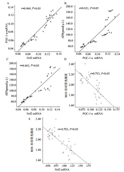 A: PGC-1α与Nrf2 mRNA;B: ATP与PGC-1α;C: ATP与Nrf2 mRNA;D: ROS与PGC-1α;E: ROS与Nrf2 mRNA 图 1 ATP水平、ROS水平与PGC-1α和Nrf2 mRNA水平的相关性分析