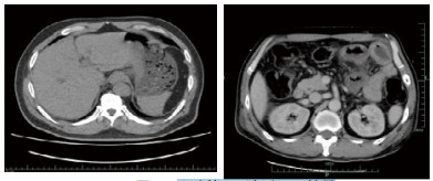 入院后在中心静脉压、有创动脉血压、每小时尿量、血气分析等严密监测下扩容补液、纠正酸中毒、亚胺培南西司他丁钠针联合利奈唑胺针抗感染、持续性血液净化纠正内环境等综合治疗后,病情逐渐好转,尿量增加,酸中毒纠正,肾功能恢复,血钠、血酮体降至正常,血糖控制在10 mmol/L以下。入院后第2天发现患者右上肢肢端温度低,右拇指发黑,血管超声示右上肢肱动脉远心端管腔闭塞,食道超声提示主动脉瓣近无冠瓣基底部可见4 mm×4 mm中等回声。入院第3天复查CT示肠系膜上静脉及门静脉积气消失(图 2)。入院第4天血培养回报:左侧外周为产气肠杆菌,右侧外周为草绿色链球菌,根据药敏结果调整抗菌药物为头孢曲松针联合左氧氟沙星针治疗,患者病情逐渐好转后出院。