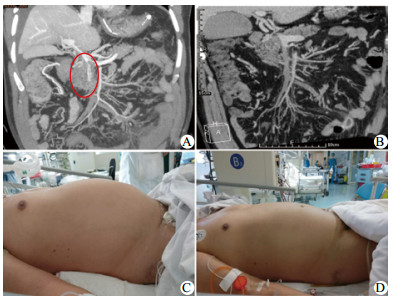 A:术前CTA示SMV-PV主干及分支广泛血栓形成(圆圈内),肠壁分层、肠腔明显扩张、腹腔积液;B:术后1个月CTA示SMV-PV及分支血栓部分再通,SMV侧枝循环形成,肠腔无扩张及坏死;C:术前平卧位,可见全腹膨隆明显;D:术后第4天平卧位,可见腹围明显减小 图 1 患者术前术后CTA和体征