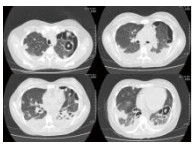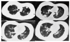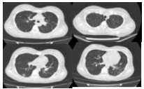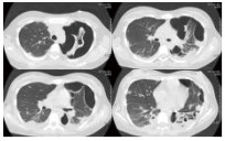 患者住院时高热,喘憋比较明显,影像学提示双肺弥漫性浸润病灶(图 1)。最初考虑可能为多发肺部转移瘤?随着治疗的好转以及影像学的演变,最终排除了肺部转移瘤的诊断。
