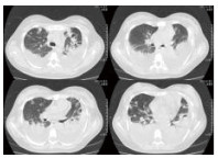 入院相关化验结果,血常规:WBC 0.8 g/L, NE 0.5 g/L, HGB 126.0 g/L, PLT 47.0/L;血气分析:pH 7.450,PaCO2 32.90 mmHg,PaO2 52.50 mmHg,SaO2 89.3%, LAC 3.9 mmol/L, HCO3- 22.5 mmol/L;心肌标志物:CK 4 668 U/L,MB 46.2 ng/mL,cTnI 0.52 ng/mL,MyO 1 884 ng/mL;肾功能:UREA 7.10 mmol/L,CREA 80.7 μmol/L,Glu 8.35 mmol/L,Na+ 131 mmol/L,K+ 3.9 mmol/L;肝功能:ALT 47 U/L,AST 211 U/L,ALB 22.4 g/L,TBIL32.93 μmol/L,DBIL 19.01 μmol/L; D-Dimer 18 893 μg/mL;BNP 986 pg/mL;ESR 66 mm/h;CRP 320 mg/L; 降钙素原53.8 ng/mL。腹部B超(-);子宫附件B超(-);超声心动图(-)、入院前胸部CT平扫提示双肺多发片状、团块病灶,见图 1