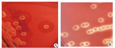 图 7 A:双溶血环金黄色葡萄球菌24 h的菌落形态; B:金黄色葡萄球菌标准菌株的菌落形态