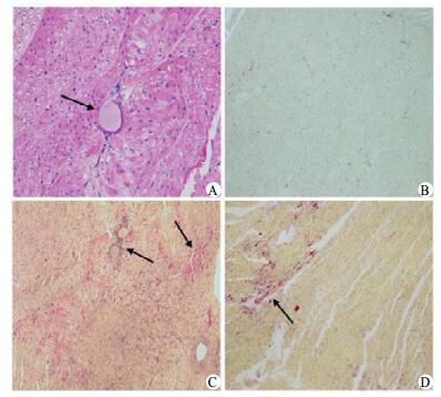 A:为CME组局部心肌微梗死灶HE染色,箭头示微球,×400;B~D:分别为Sham组,CME组,CME+尼可地尔组HBFP染色,缺血心肌红染,箭头示微梗死灶,HBFP染色,×200 图 1 HE和HBFP染色 Figure 1 HE and HBFP staining |