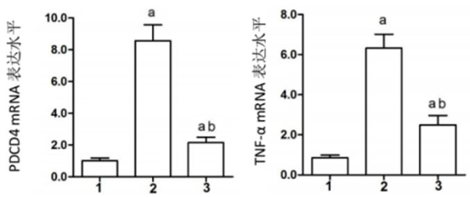 1:Sham组,2:CME组,3:CME+尼可地尔组; 与Sham组相比较,aP < 0.05;与CME组相比较,bP < 0.05 图 2 荧光定量PCR检测PDCD4和TNF-α mRNA表达量 Figure 2 PDCD4 and TNF-α mRNA transcription in myocardial tissues as detected by fluorescence quantitative PCR |