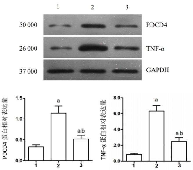 1:sham组,2:CME组,3:CME+尼可地尔组; 与Sham组相比较,aP < 0.05;与CME组相比较,bP < 0.05 图 3 Western blot检测PDCD4和TNF-α蛋白相对表达量 Figure 3 PDCD4 and TNF-α protein expression in the myocardium |