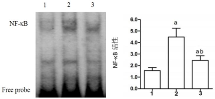 1:sham组,2:CME组,3:CME+尼可地尔组; 与Sham组相比较,aP < 0.05;与CME组相比较,bP < 0.05 图 4 EMSA检测NF-κB活性 Figure 4 EMSA detecting NF-κB activity |