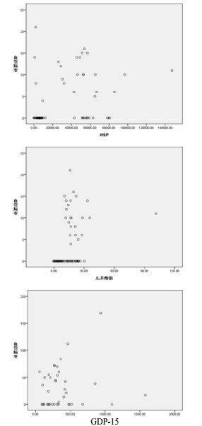 (3) Gensini总积分等于如上积分之和。结果显示GDF-15血清水平的升高与血管病变的Gensini积分结果具有相关性,相关系数是0.131(P > 0.05),结果表明不具有相关性。同理,血清HSP-70、儿茶酚胺(肾上腺素、去甲肾上腺素、多巴胺)水平与ACS不具有相关性,见图 1。
