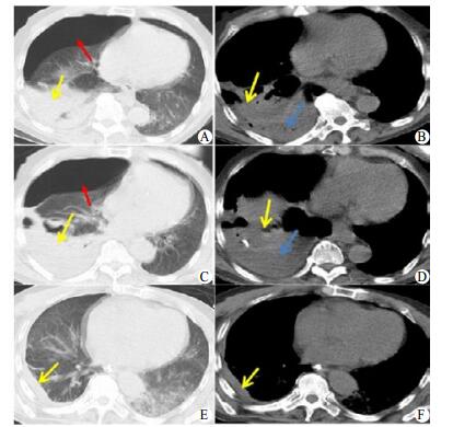 入院2 d:右肺压缩约60%(红色箭头所指为气胸),右肺下叶感染灶(黄色箭头所指为感染灶),右侧少量胸腔积液(蓝色箭头所指为胸水)(图A和B)。入院10 d:右肺压缩约60%(红色箭头所指为气胸),积液较前明显增多(蓝色箭头所指为胸水)(图C和D)。入ICU 48 d:气胸吸收,感染灶明显吸收好转(图E和F,箭头所指为感染灶) 图 1 胸部CT动态变化 |