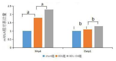 sham组:假结扎组,BDL组:胆道结扎组,BDL+OA组:胆道结扎并灌胃齐墩果酸; aP < 0.05,bP > 0.05 图 1 Mrp4、Oatp1在mRNA水平的表达变化 Figure 1 the changes of Mrp4/Oatp1 in the mRNA level |